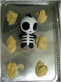 Once your cookie mix has been stirred well enough, start putting globs of it onto the cookie sheet. Make sure the globs are big enough though, because if you make them too small, you won't be able to get enough of Boo Berry's face on them when it comes time to use the cookie cutters. And yes, Spooky decided to take a nap with the globs. What can I say... he likes 'em.