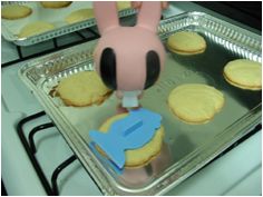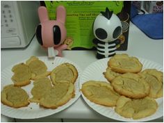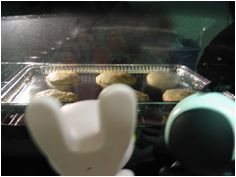 Once you have your cookie globs completed, throw 'em in the oven and let 'em cook until they're slightly brown around the edges. Just look at Filler Bunny and Spooky... they can hardly wait for that warm cookie goodness to come out of the oven. Yummy!