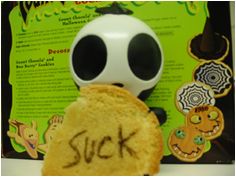 Awww, come on Spooky, don't be upset just because you got the Count Chocula cookie cutter. Actually, who can blame ya? What you wrote on that cookie was probably quite appropriate. And now it is time for the final taste test. Since we can't have Filler Bunny and Spooky (aka: The Chefs) taste test their own creations, I had Spadowsky (a regular on the I-Mockery Message Forums) volunteer to be their cookie guinea pig. You're a brave, brave man Spadowsky. Good luck.