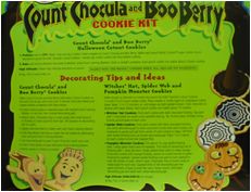 Now when making these cookies you'll need some supplies. The kit itself comes with two packets of sugar cookie mix, each of which can make up to 3 dozen cookies (I guess that'd be true if the cookies were the size of a tree larvae). It also includes the Boo Berry and Count Chocula (hiss!) cookie cutters, and some FDA approved food coloring markers so that you can color in your cookies to make them look more lifelike. So what else will you need? Well, you'll need a bowl and a spoon to mix up the cookie dough. You'll need a stick of butter or margarine to bring you closer to that first heart attack. And, you'll need a cookie sheet (or two) to bake the cookies on. Oh and I almost forgot, you'll need one last item...