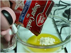 Once the butter has been melted, tear open your pouch of sugar cookie mix and pour it into the bowl with da buttah. Filler Bunny may be small, but he's a strong little fella. Just look at him hold up that giant pouch of cookie mix all by himself! That's the equivalent of a human holding up a bag of cement that's twice his or her size! Wow!