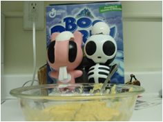 Ha Ha! For once Boo Berry doesn't get screwed! This time it's Frankenberry who has been left out of the picture, but that stupid Count Chocula is still there. Oh well, better than nothing. And no, the cookie kit doesn't come with a free box of cereal, I just left that in the picture because... well, it's a box of Boo Berry cereal, and you can never have enough photos of that stuff. Now, I decided it would be fun to show all of you Boo Berry fans a step by step process of creating your very own Boo Berry cookies. And for those of you who are wondering where to buy these, they were found at Target during the Halloween season... so keep an eye out for them again when that time rolls around every year! Anyway, rather than have my own face plastered all over the piece as I make the cookies, I decided to let two different characters entertain you as they create the cookies from scratch.