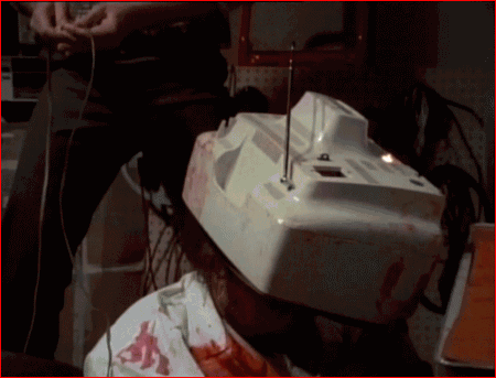 First, Henry grabs a soldering iron and jabs it into the guy's hand, and then repeatedly stabs him in the chest with it while Otis holds him down. When he tires of that, Henry picks up the TV and smashes it directly onto his head. So if you happen to be in sales and you get the urge to yell at one of your customers, make sure said customer isn't a serial killer.