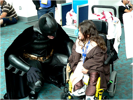 Batman crouches down to talk to a young, disabled fan in a Jedi costume.