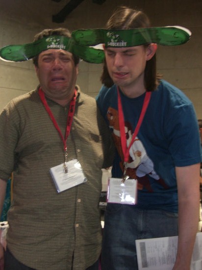 This was one of the few people who couldn't fit a pickle hat on his head, but he was still determined to try.