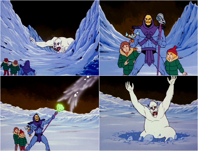 Before they have the chance to discuss Christmas any further, a giant Snow Beast appears before them and is set to attack. The kids all run and hide behind their nice new friend, Skeletor who prepares to defend them. It tries blasting them with its icy breath, but it's no match for Skeletor's magic. Skeletor then blasts a hole in the ice which the Snow Beast falls through and the kids thank him for being so wonderful! It is here that we see one of the most unnatural things ever in a cartoon.