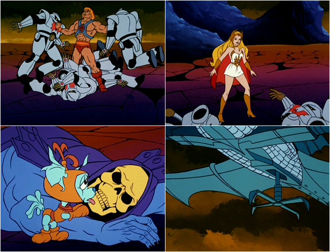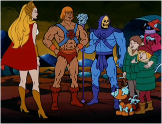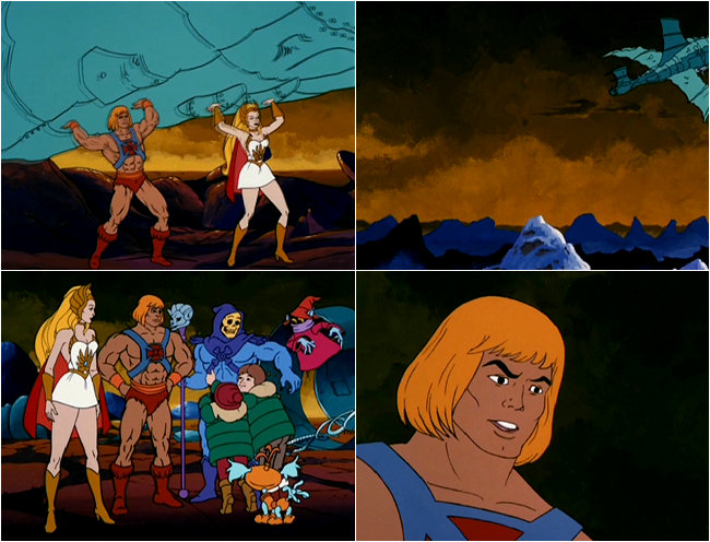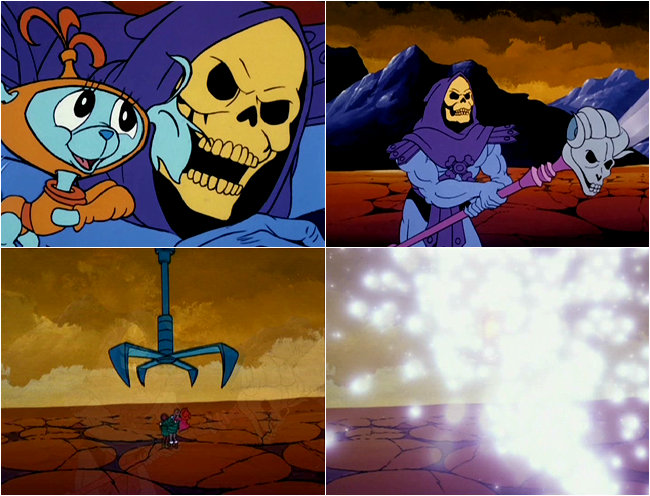 He-Man and She-Ra lift up the ship and give it a mighty chuck into outer space before Horde Prime is able to blast Skeletor to smithereens. The kids run up to Skeletor and give him a big hug and thank him for saving them. "HE saved YOU!?" He-Man asks in a state of understandable bewilderment.
