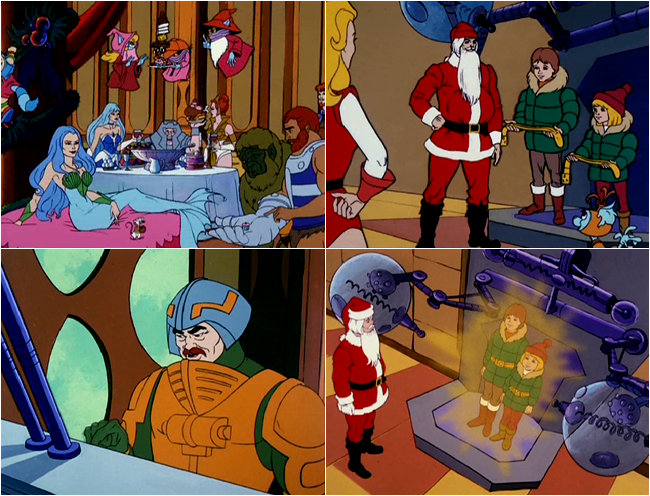 While Fisto is apparently discussing the merits of tiny cupcakes with Moss Man much to Mermista's amusement, Man-At-Arms is preparing to send the kids back to their home on Earth. So Adam is dressed up as Santa Claus and my god, does he ever look wrong. I think it's primarily because his stomach looks like a big tumor, but the fact that he didn't change his bowl haircut isn't helping matters either. Before the kids are sent back to Earth, he gives them each some magical flying belts. Shit, I wish Santa would bring ME a flying belt. Normally I wouldn't let a Santa with a bowl cut and a giant tumor come within a thousand yards of my property, but if he came with the promise of flying belts? I guarantee you he'd be the guest of honor at my dinner table that night.