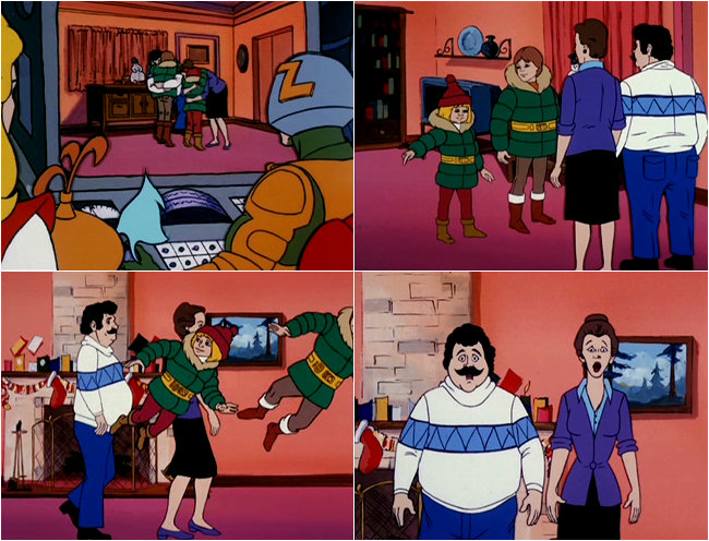 With the Carium water crystal all charged up, Man-At-Arms teleports the kids back home. Once again, they apparently have some hidden camera because they're able to watch the kids reunite with their parents on the big computer monitor there. Science! Upon reuniting with their parents, Miguel actually adresses them as "mother" and "father". Yeah, it's clear that this family has a really close relationship. Anyway, despite all the details the kids provide, the parents naturally don't believe their story about all the adventures they had and tell them it's time for bed. The two of them oblige, but they go to bed in style by flying right on past their parents with the aid of their special belts. The parents then break the fourth wall and turn directly to the camera with an astonished "WHAAAAAAAAAAA!?!?!?" look on their faces. Will the laughs ever cease?