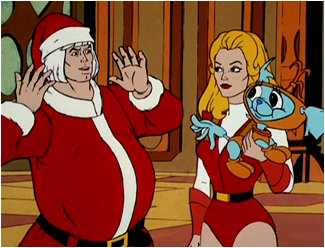 Back on Eternia, Adam does his best Santa impersonation, but his ho-ho-ho's are far too nasal sounding to fool his sister. She rips his fake beard off and and now Adam looks even more disturbing in that Santa suit. So he actually bleached his hair? I gotta give Adam credit... that's dedication to the role of Santa. Creepy dedication, sure... but dedication nontheless.