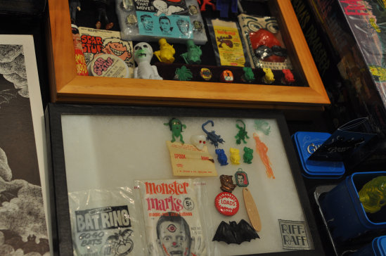 Various monster novelties, mini-figures, buttons, and even a pack of Fleer Monster Marks which